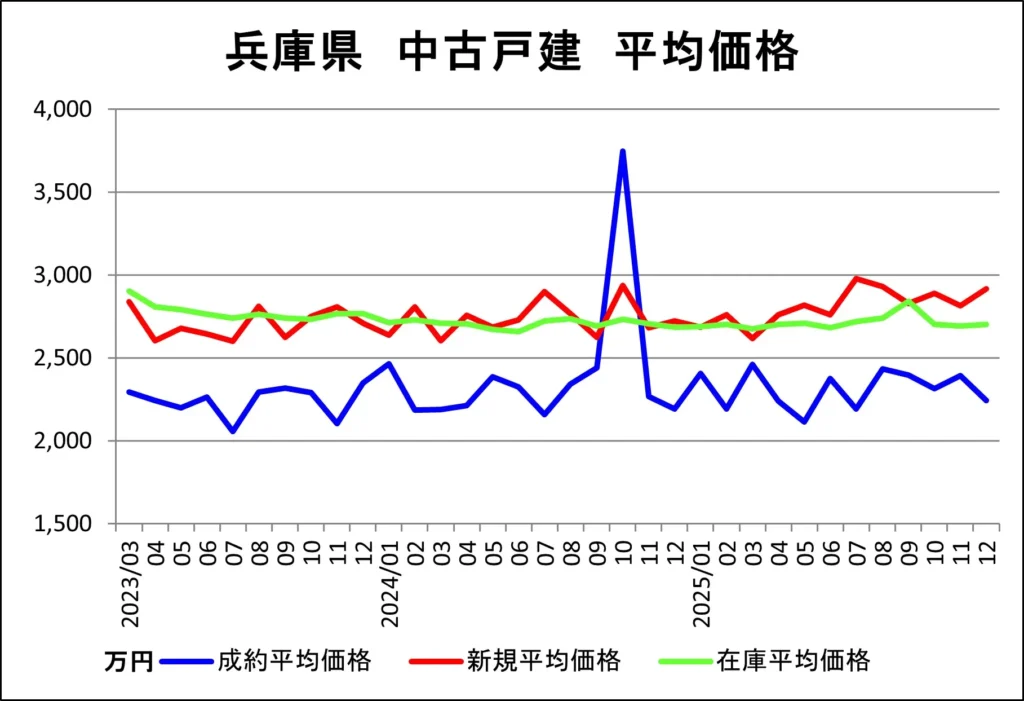 兵庫県の中古一戸建て成約、販売中在庫、新規販売の各㎡単価推移