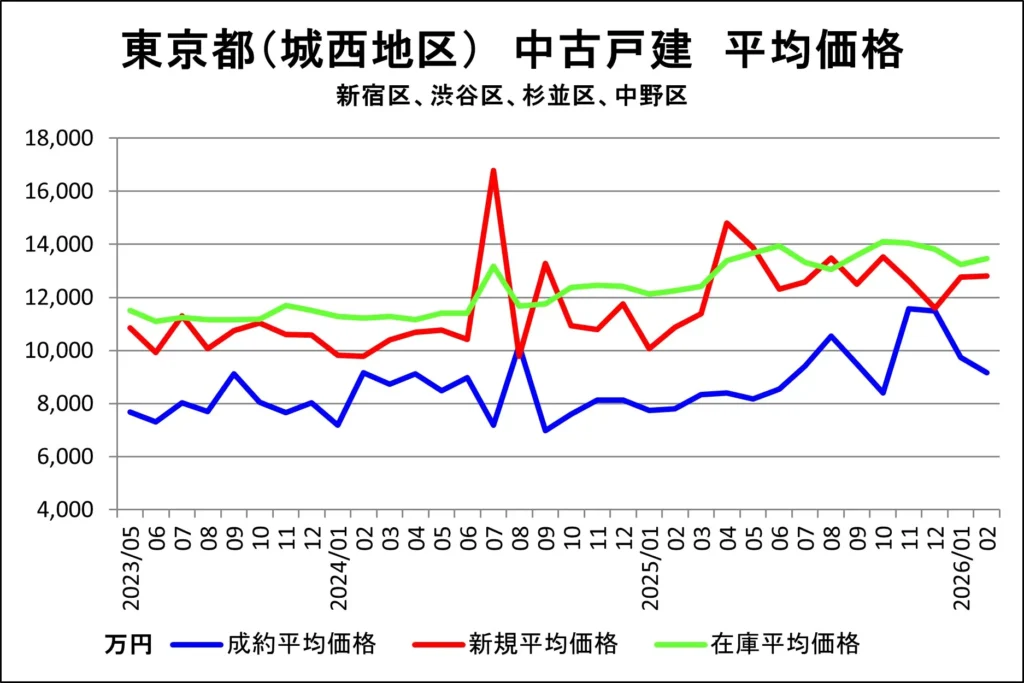 中古一戸建て成約、販売中在庫、新規販売の各㎡単価推移