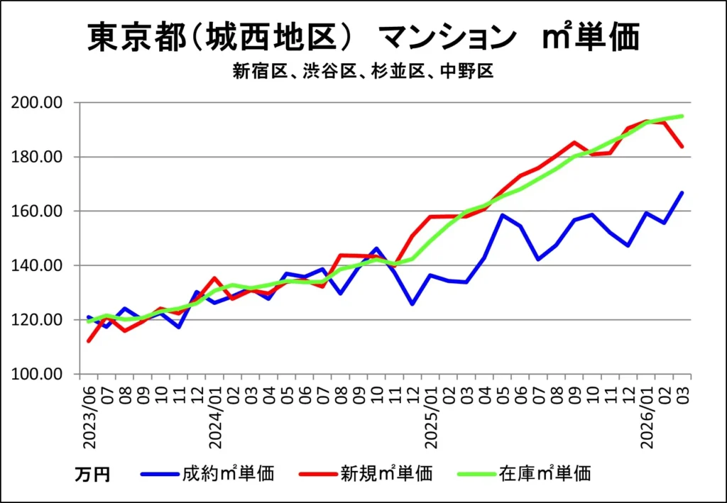 杉並区の中古マンション相場と価格推移・中古マンション成約、販売中在庫、新規販売の各㎡単価推移