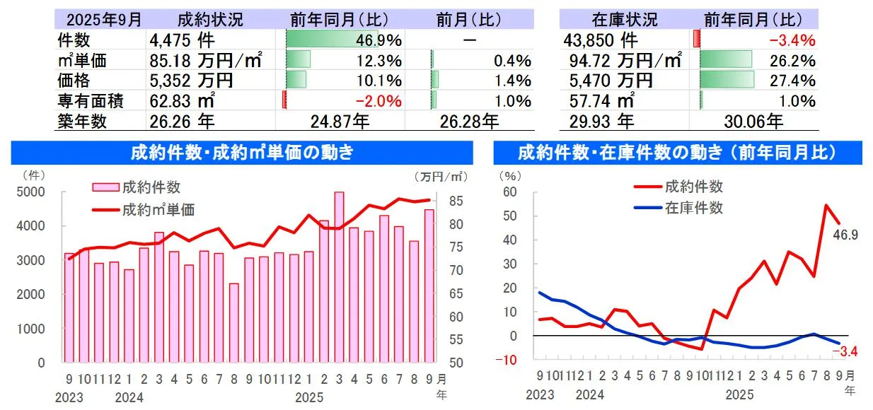 中古マンション 成約㎡単価は 65 ヶ月連続上昇。在庫件数は 2 ヶ月連続で減少