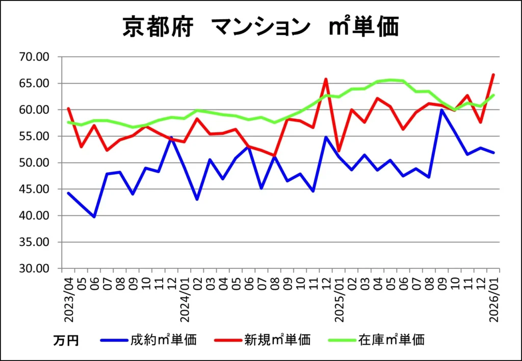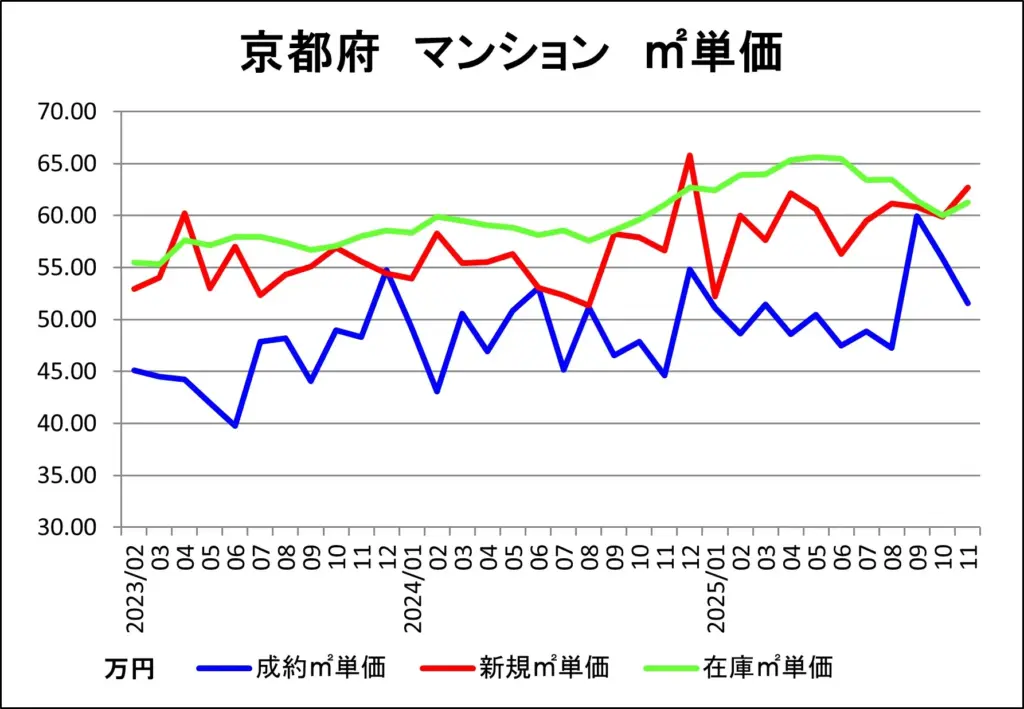 京都府の中古マンション成約、販売中在庫、新規販売の各㎡単価推移