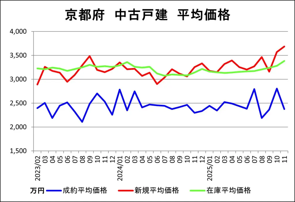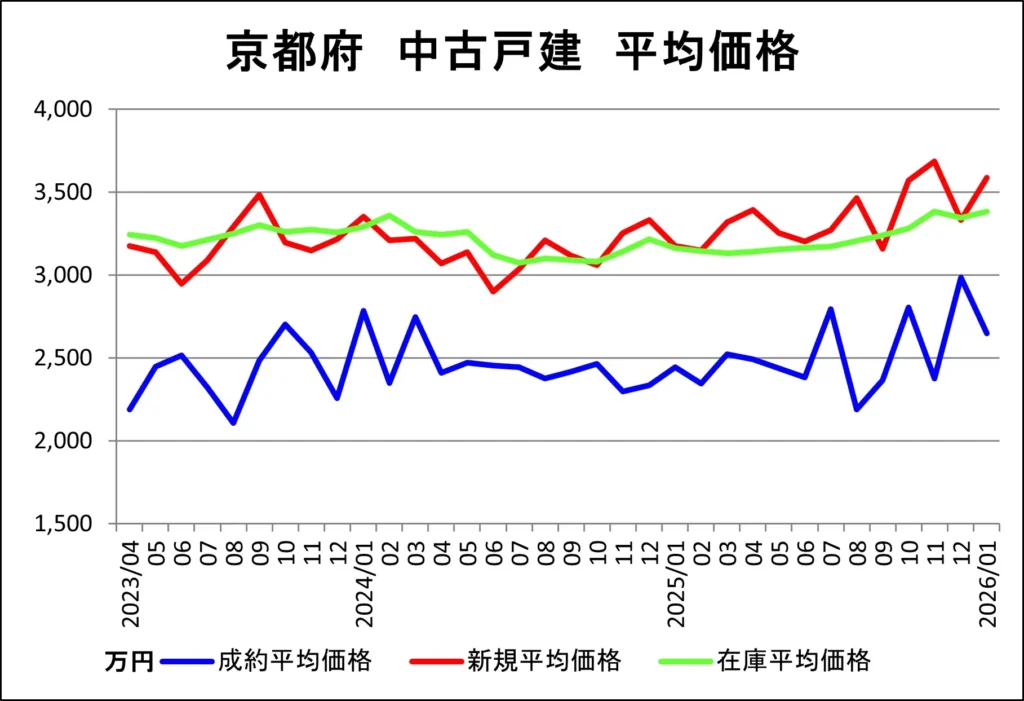 ここでは、近畿圏不動産流通機構(近畿レインズ)から毎月1回発表される中古一戸建て売買市況データを基に、京都府の中古一戸建て成約、販売中在庫、新規販売の各㎡単価推移をわかりやすく図解作成して、最新の市況についてご報告いたします。