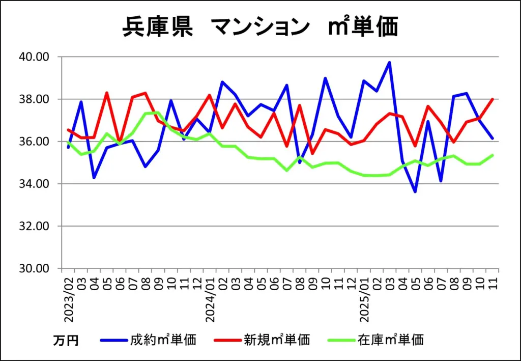 ここでは、東日本不動産流通機構(レインズ)から毎月1回発表されるマンション売買市況データを基に、最新の兵庫県の中古マンション成約、販売中在庫、新規販売の各㎡単価推移をわかりやすく図解作成して、最新の市況についてご報告いたします。