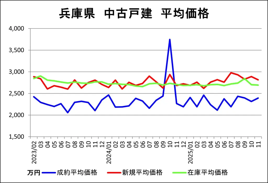兵庫県の中古一戸建て成約、販売中在庫、新規販売の各㎡単価推移