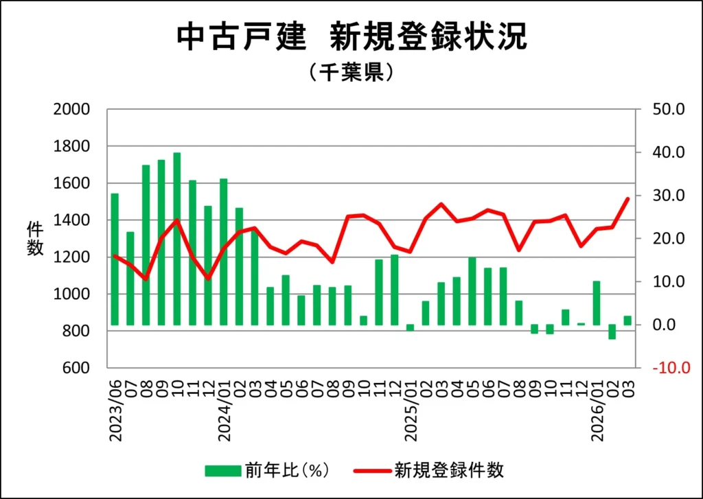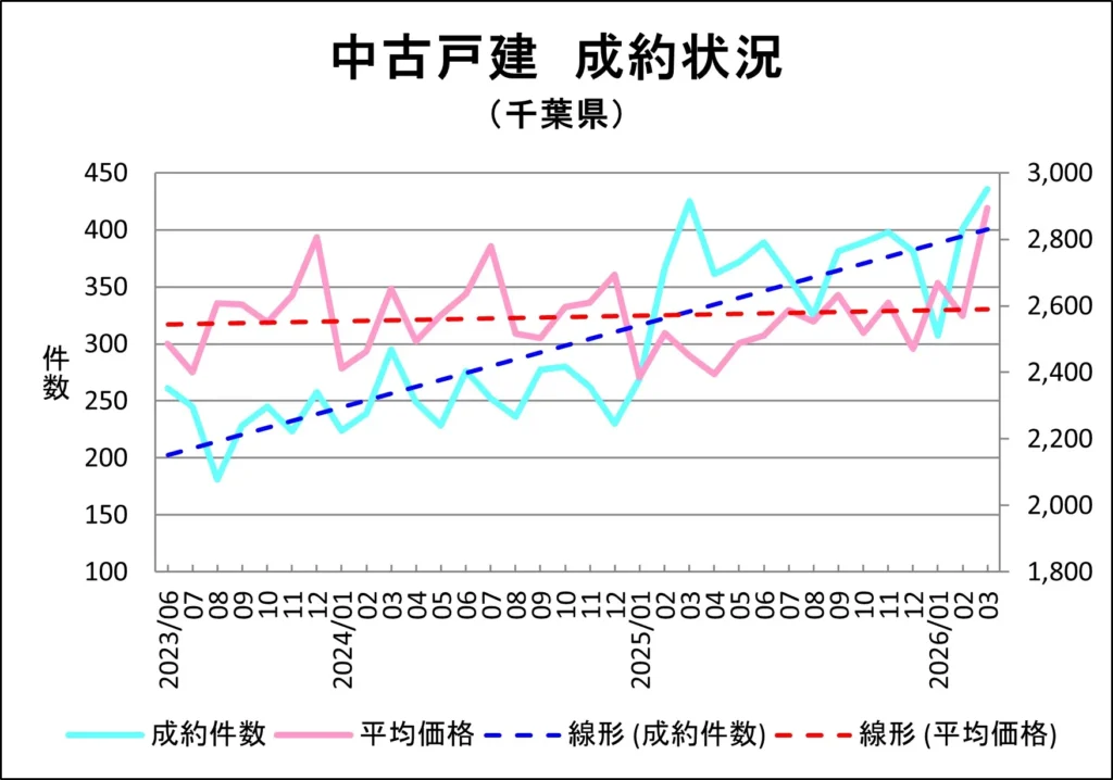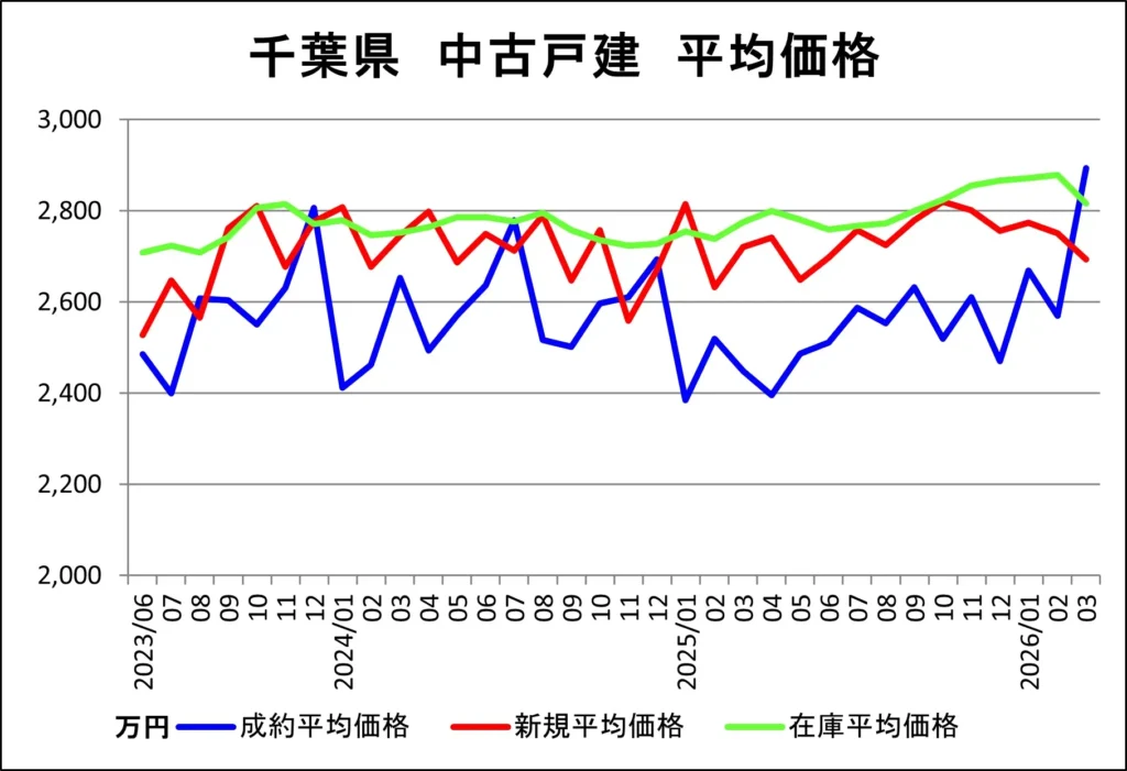 ここでは、東日本不動産流通機構(レインズ)から毎月1回発表される中古一戸建て売買市況データを基に、千葉県の中古一戸建て成約、販売中在庫、新規販売の各㎡単価推移をわかりやすく図解作成して、最新の市況についてご報告いたします。