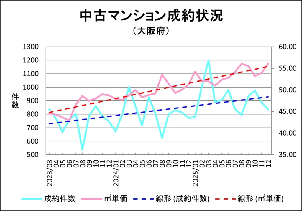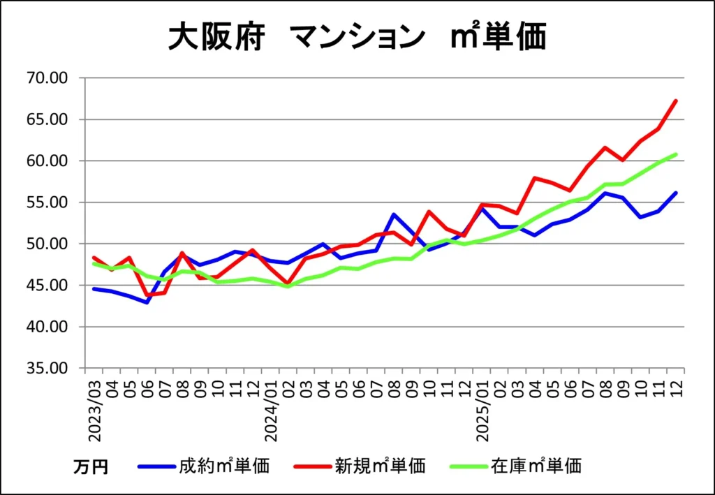 大阪府の中古マンション成約、販売中在庫、新規販売の各㎡単価推移