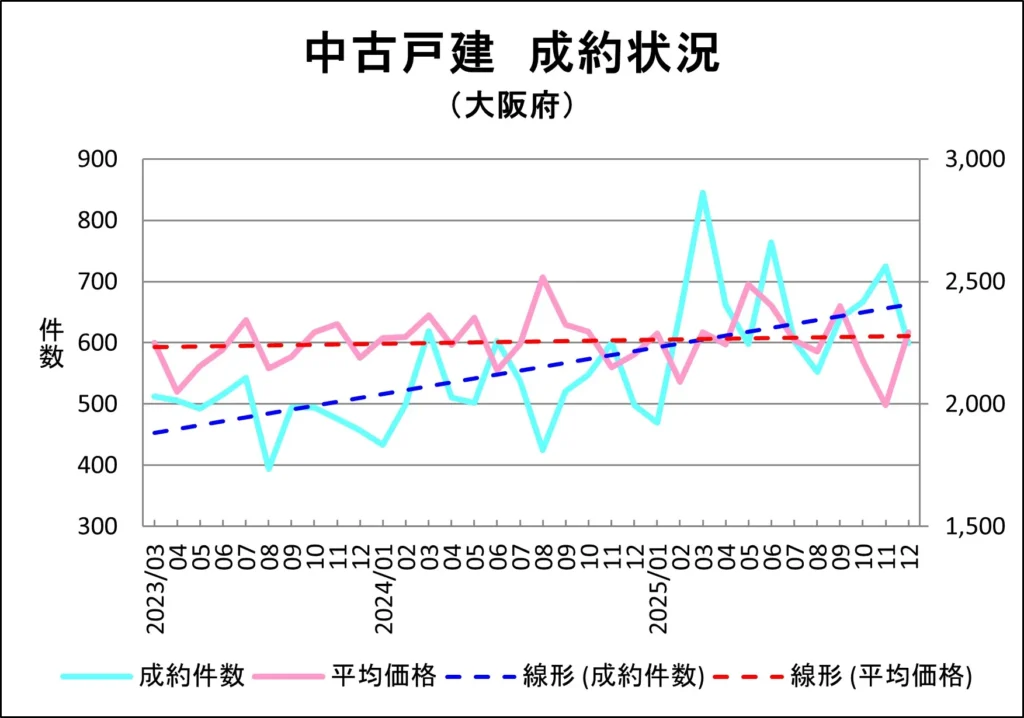 大阪府の中古マンション成約、販売中在庫、新規販売の各㎡単価推移