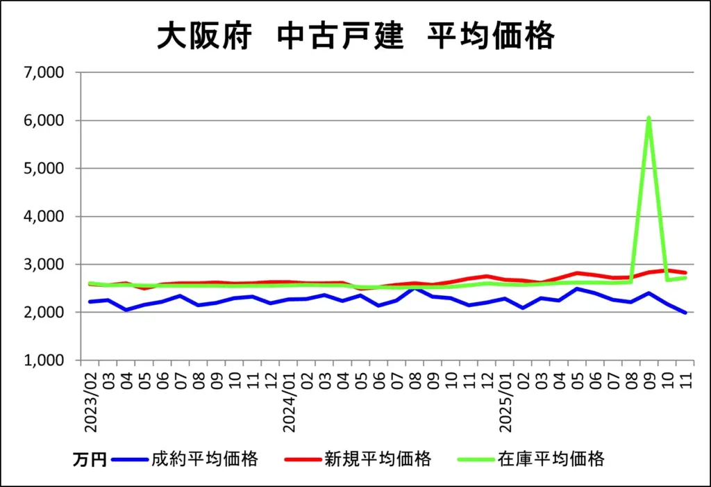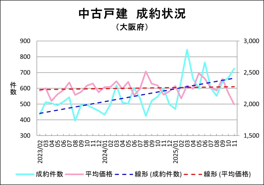 2020年9月~2021年11月の大阪府の中古マンション成約平均価格は38.45万円、成約価格は2,638万円、平均成約面積は68.62㎡となりました。