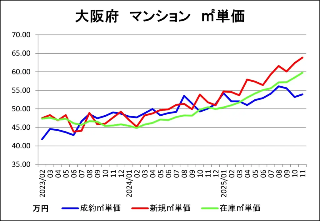 大阪府の中古マンション成約、販売中在庫、新規販売の各㎡単価推移