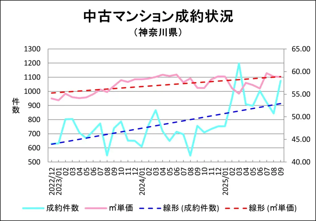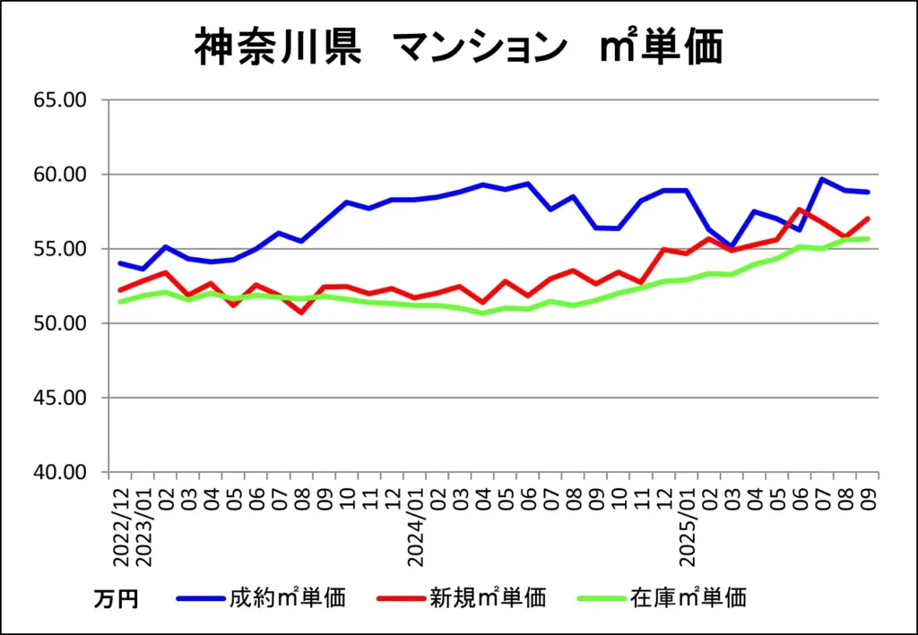 ここでは、東日本不動産流通機構(レインズ)から毎月1回発表されるマンション売買市況データを基に、平塚市内の中古マンション成約、販売中在庫、新規販売の各㎡単価推移をわかりやすく図解作成し、最新の市況についてご報告いたします。