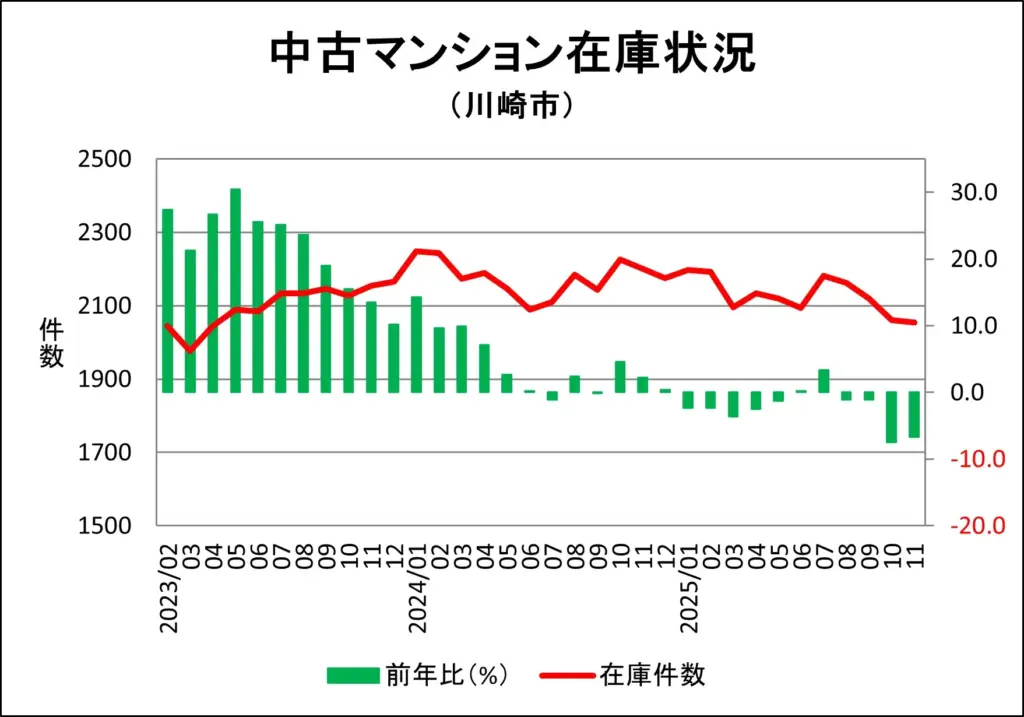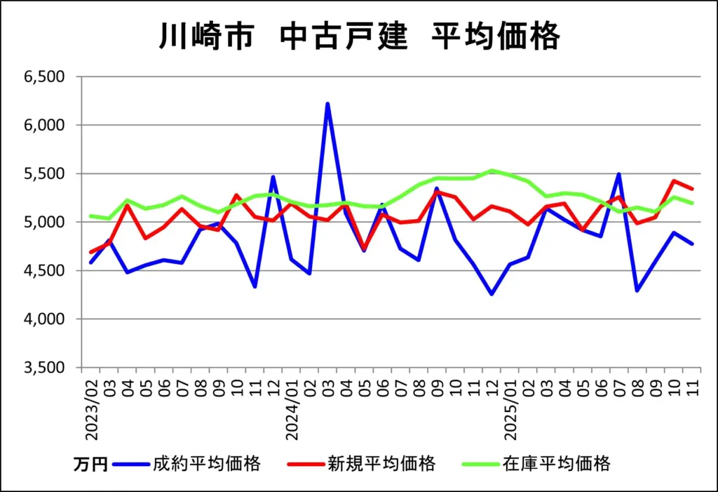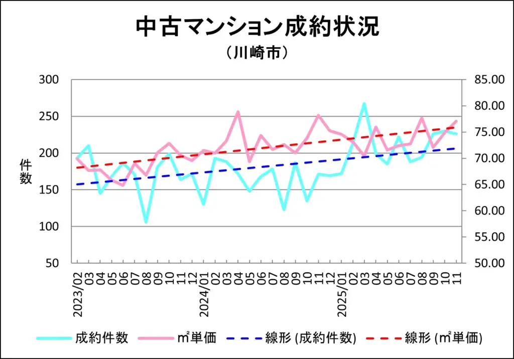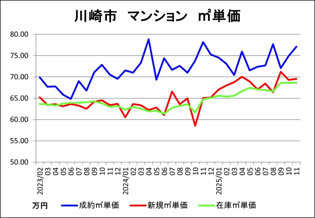 川崎市の中古マンション成約、販売中在庫、新規販売の各㎡単価推移