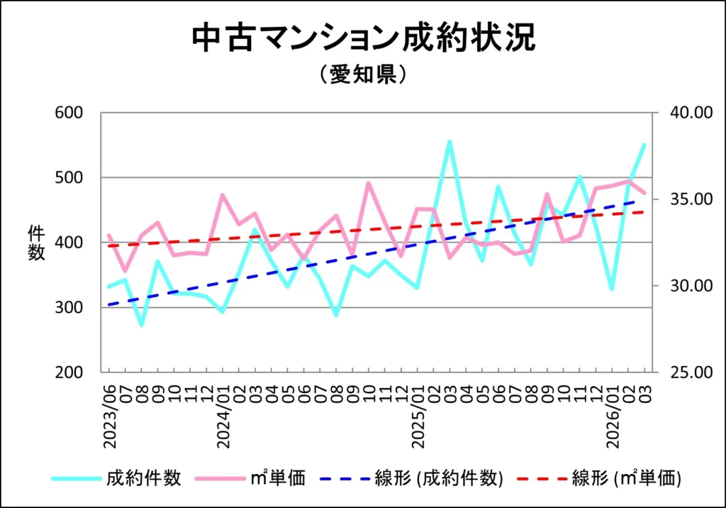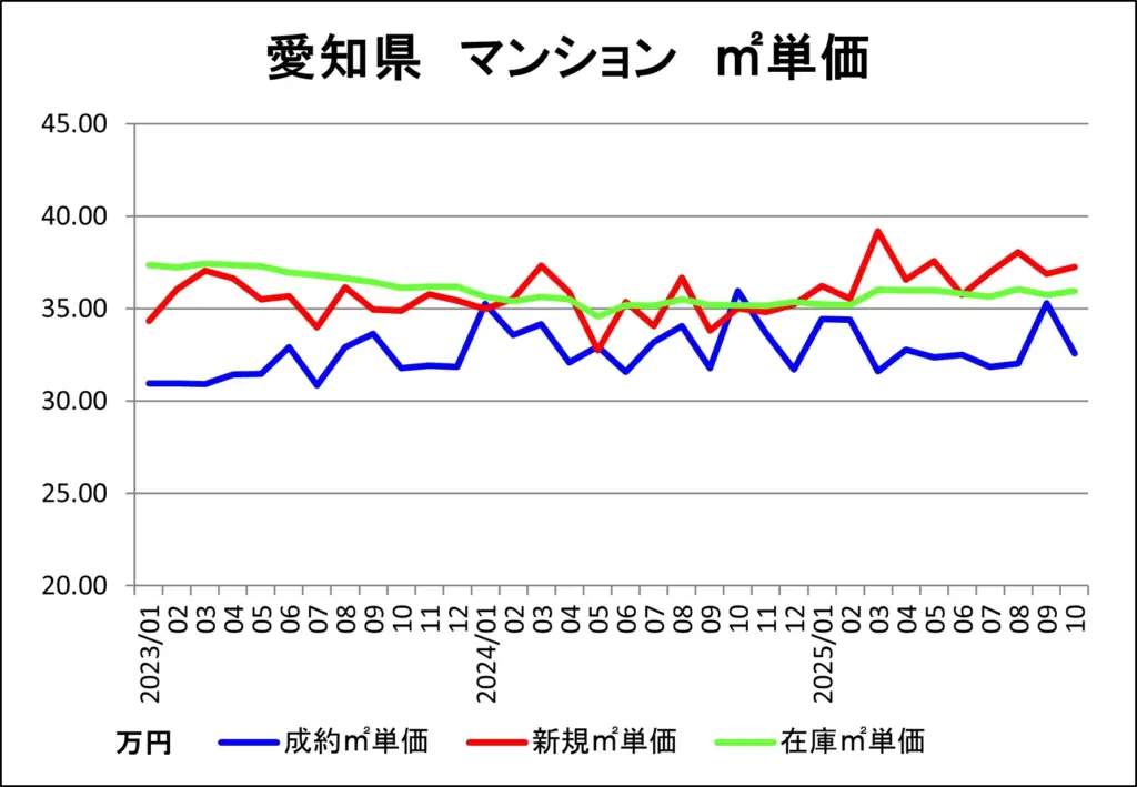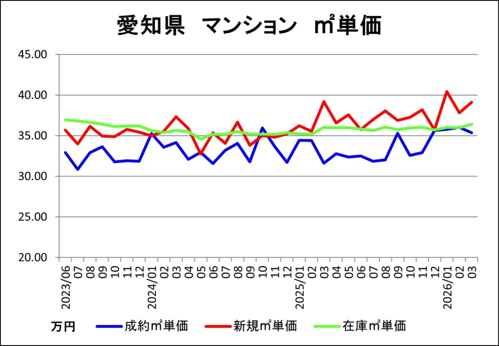 ここでは、東日本不動産流通機構(レインズ)から毎月1回発表されるマンション売買市況データを基に、愛知県内の中古マンション成約、販売中在庫、新規販売の各㎡単価推移をわかりやすく図解作成し、最新の市況についてご報告いたします。