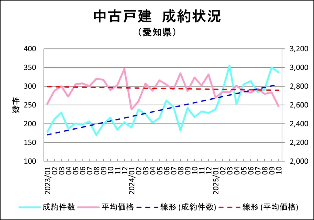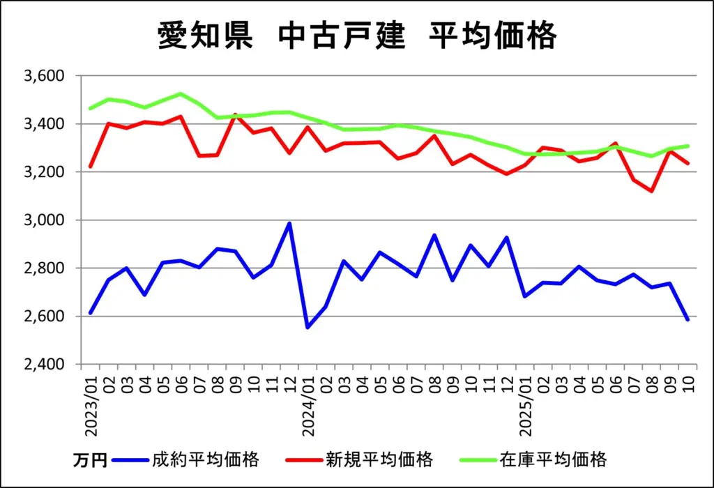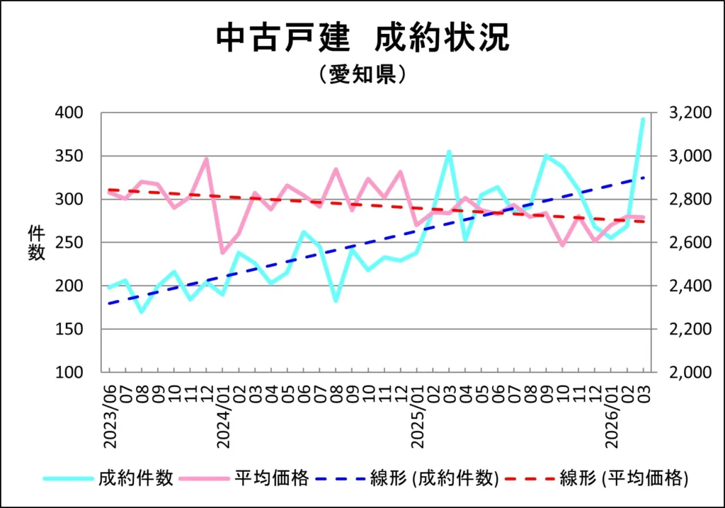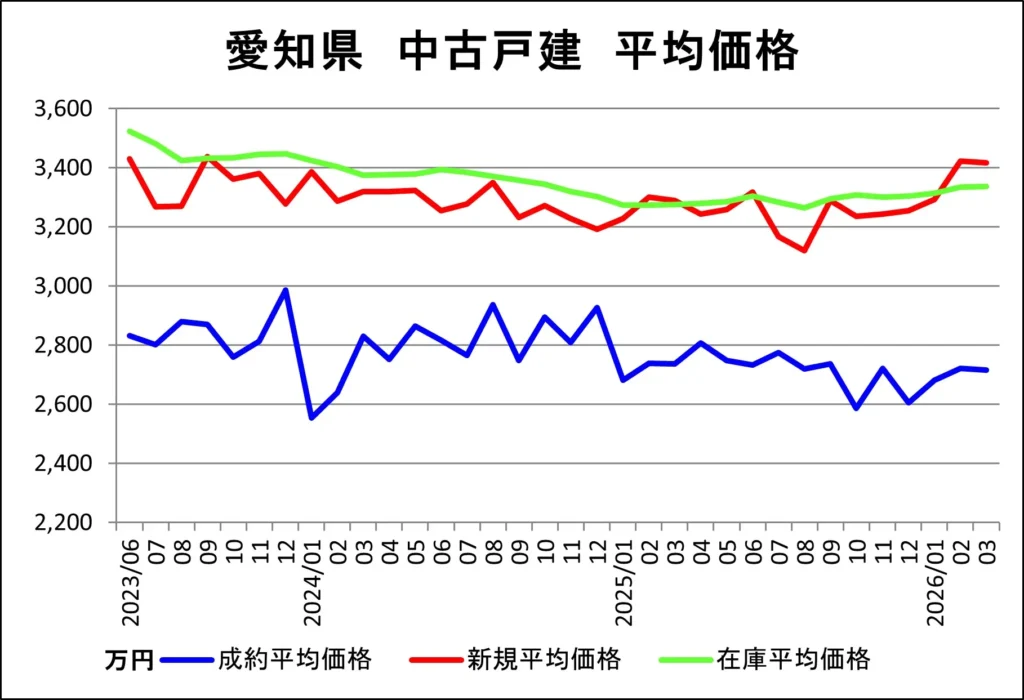 ここでは、東日本不動産流通機構(レインズ)から毎月1回発表される中古一戸建て売買市況データを基に、愛知県の中古一戸建て成約、販売中在庫、新規販売の各㎡単価推移をわかりやすく図解作成して、最新の市況についてご報告いたします。