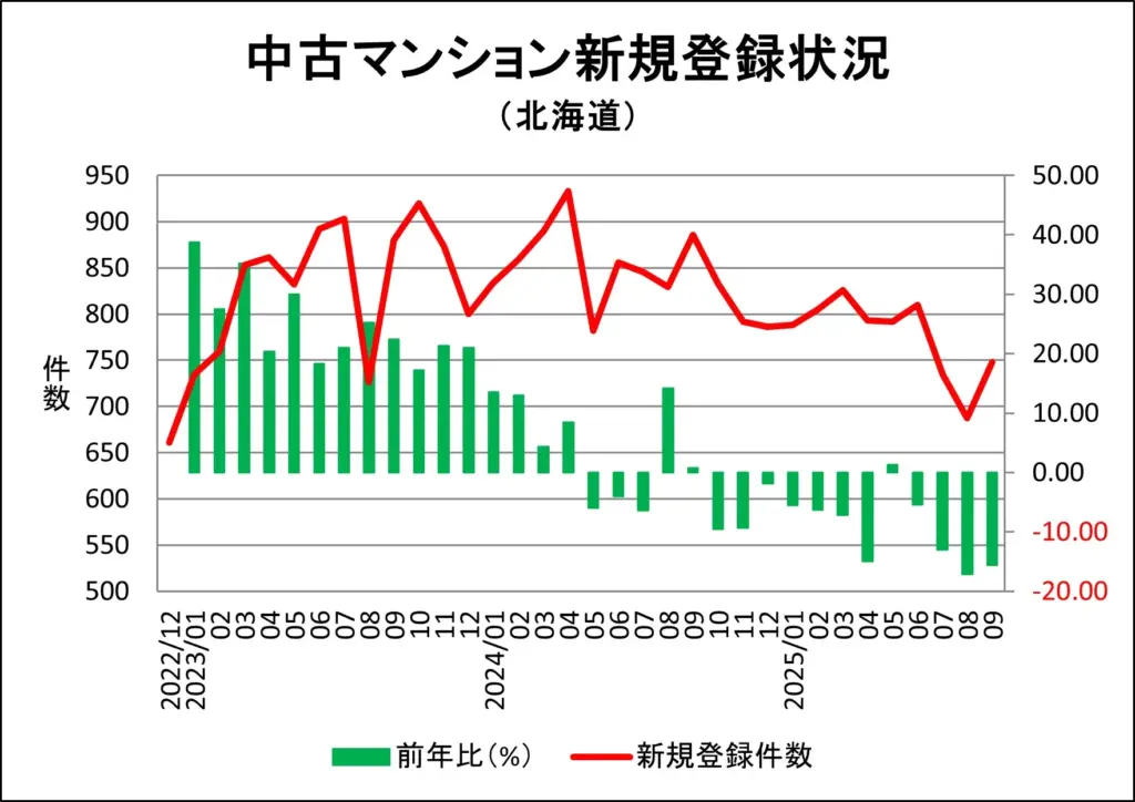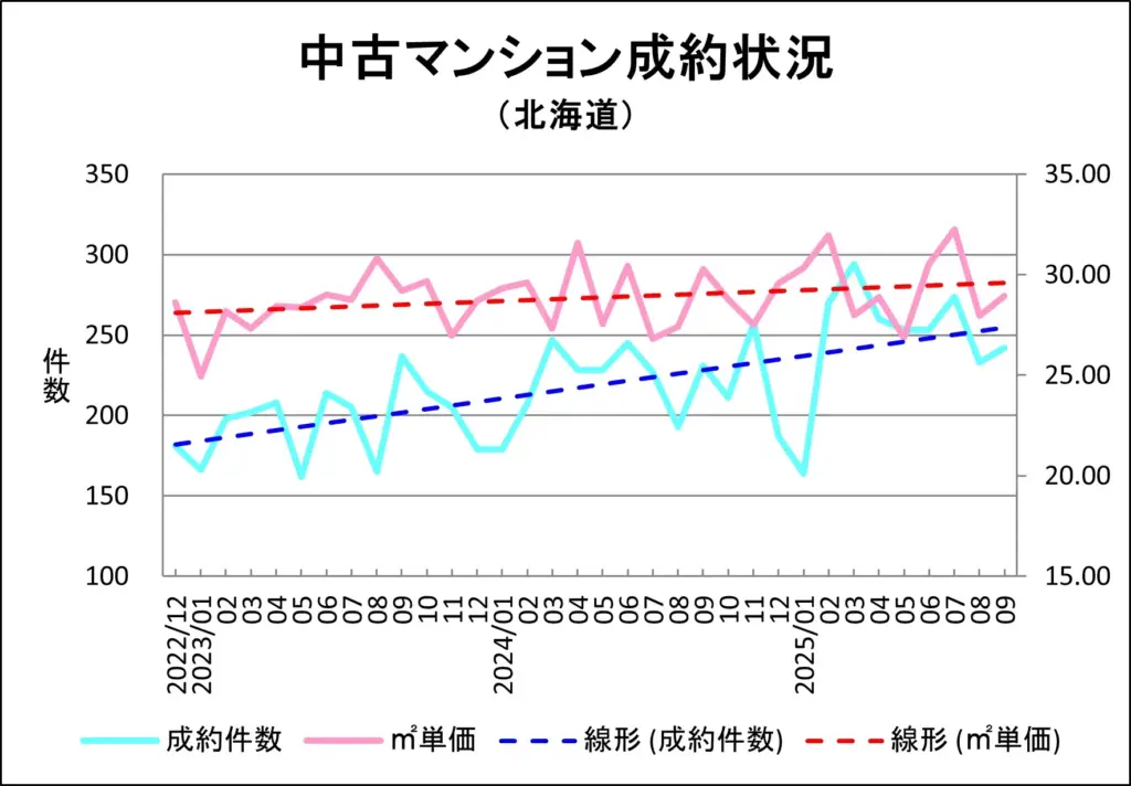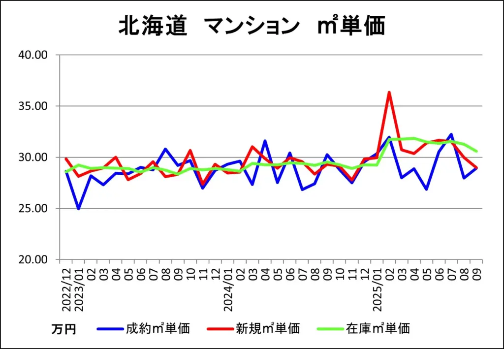 ここでは、東日本不動産流通機構(レインズ)から毎月1回発表されるマンション売買市況データを基に、北海道内の中古マンション成約、販売中在庫、新規販売の各㎡単価推移をわかりやすく図解作成し、最新の市況についてご報告いたします。