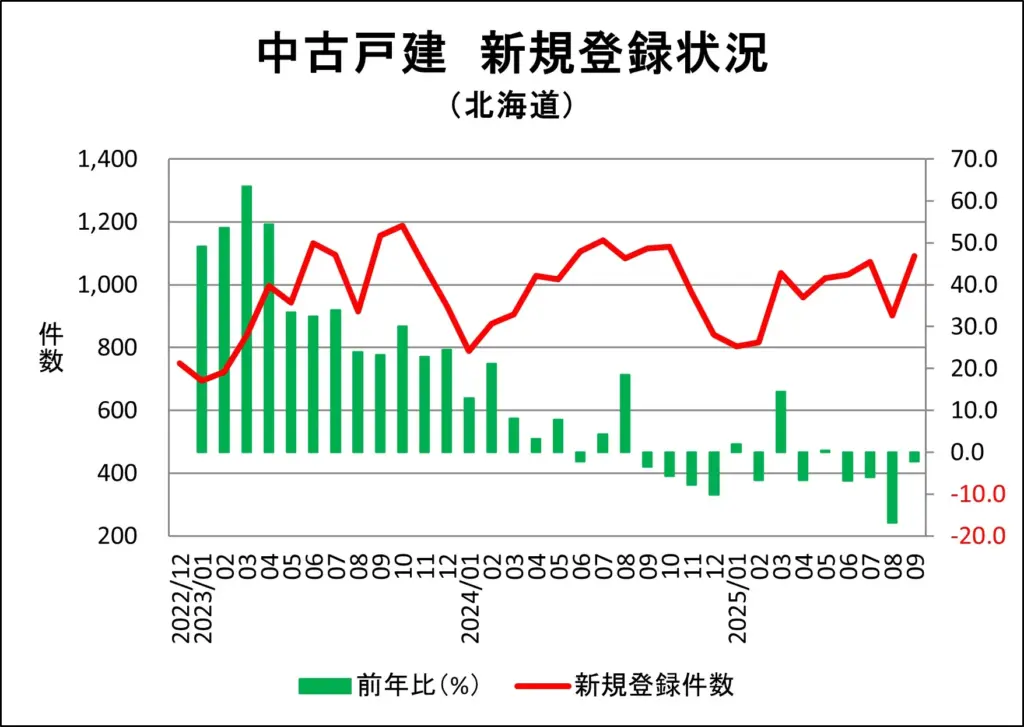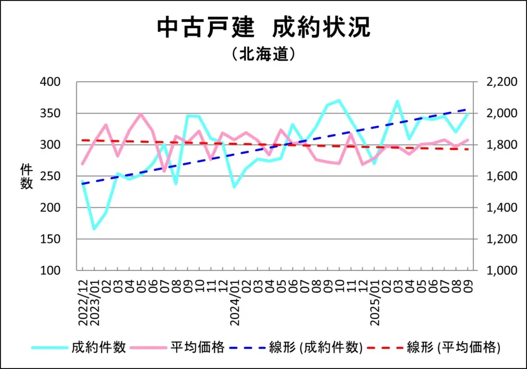 ここでは、東日本不動産流通機構(レインズ)から毎月1回発表される中古一戸建て売買市況データを基に、北海道の中古一戸建て成約、販売中在庫、新規販売の各㎡単価推移をわかりやすく図解作成して、最新の市況についてご報告いたします。