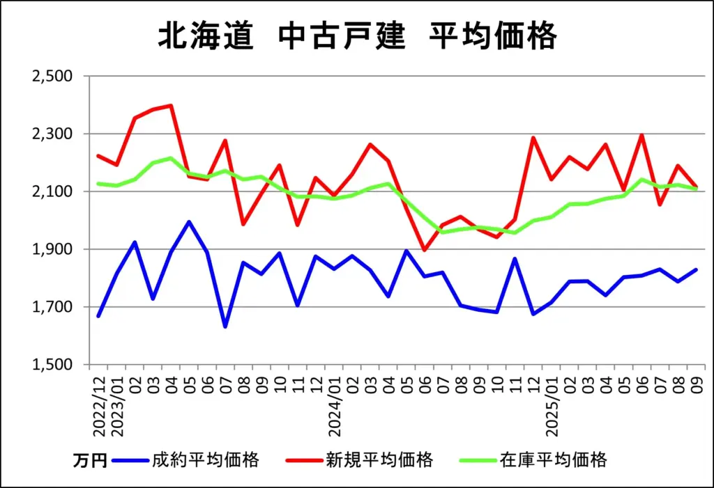 北海道の一戸建て成約、販売中在庫、新規販売の各㎡単価推移