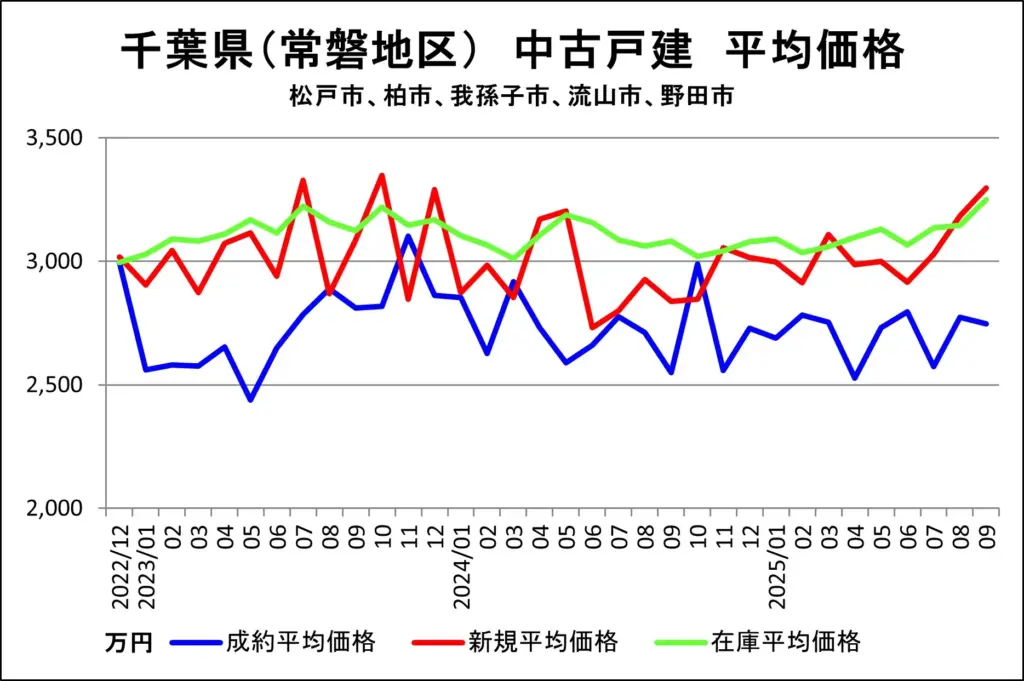 中古一戸建て成約、販売中在庫、新規販売の各㎡単価推移