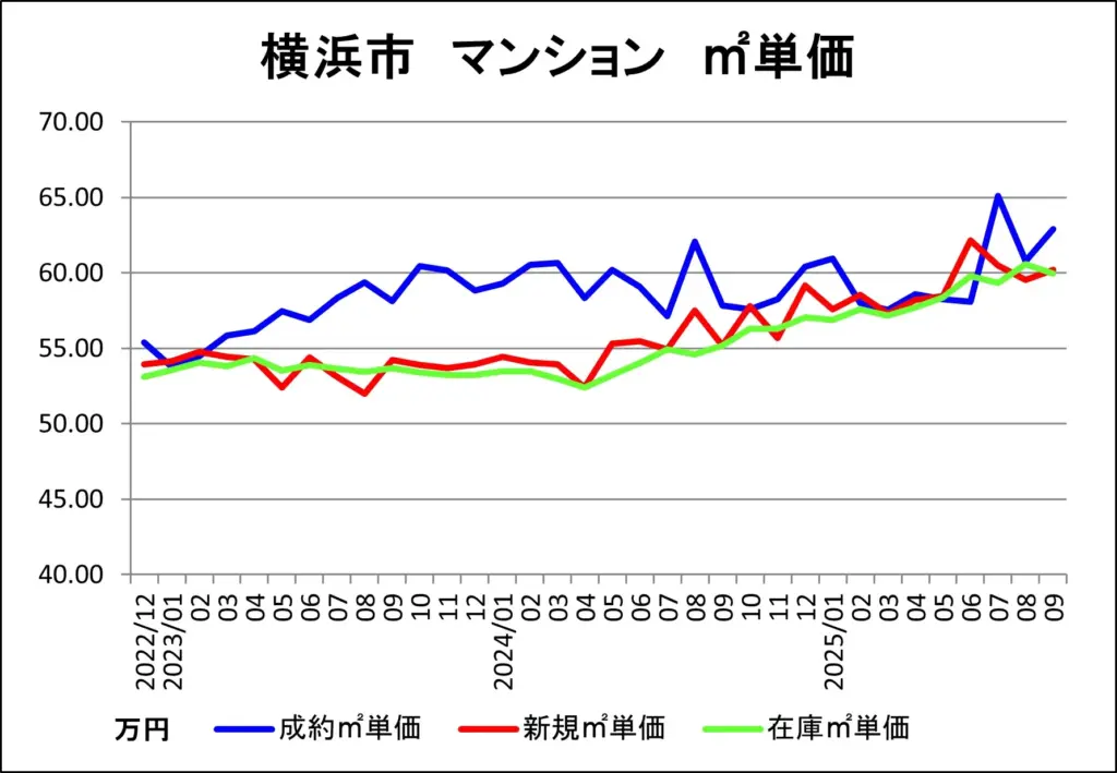 中古マンション成約、販売中在庫、新規販売の各㎡単価推移
