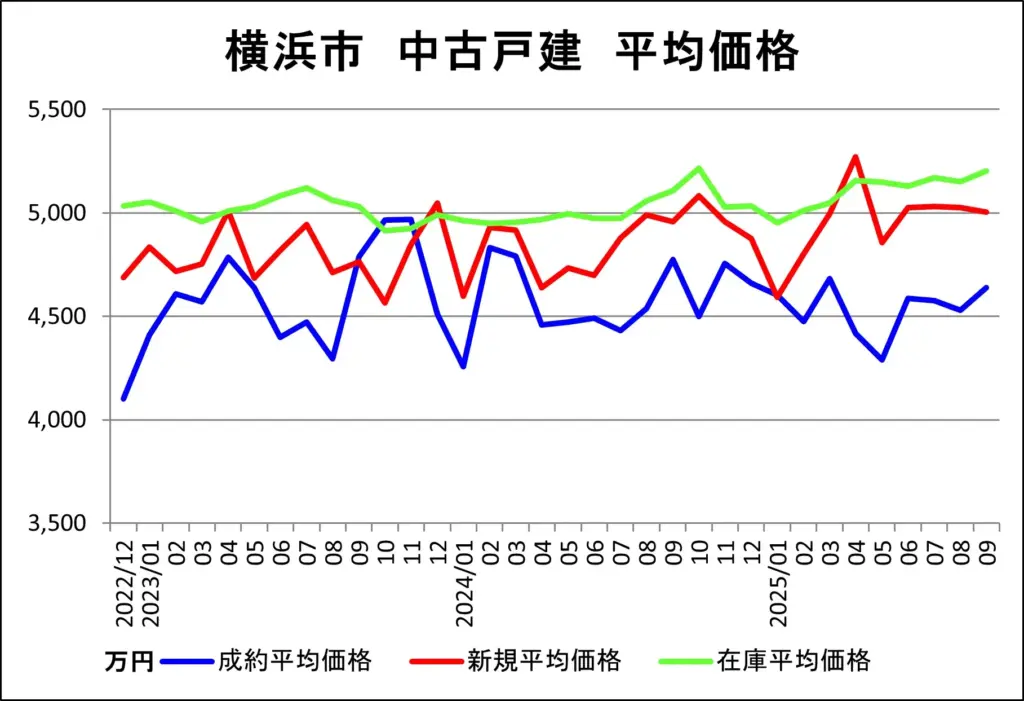 中古一戸建て成約、販売中在庫、新規販売の各㎡単価推移