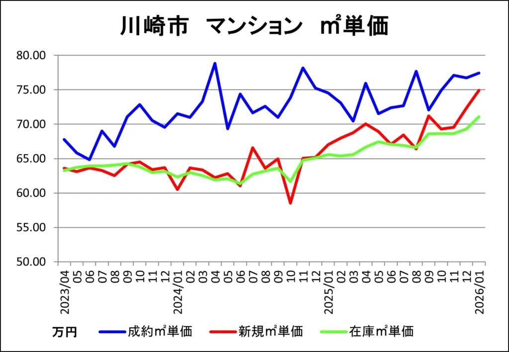 川崎市の中古マンション成約、販売中在庫、新規販売の各㎡単価推移