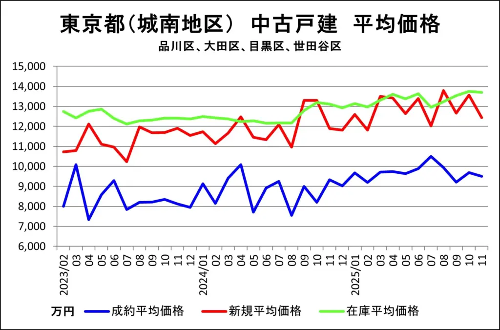 中古一戸建て成約、販売中在庫、新規販売の各㎡単価推移