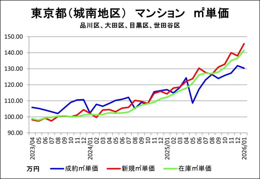 大田区の中古マンション相場と価格推移・中古マンション成約、販売中在庫、新規販売の各㎡単価推移