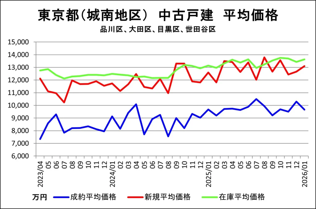 中古一戸建て成約、販売中在庫、新規販売の各㎡単価推移