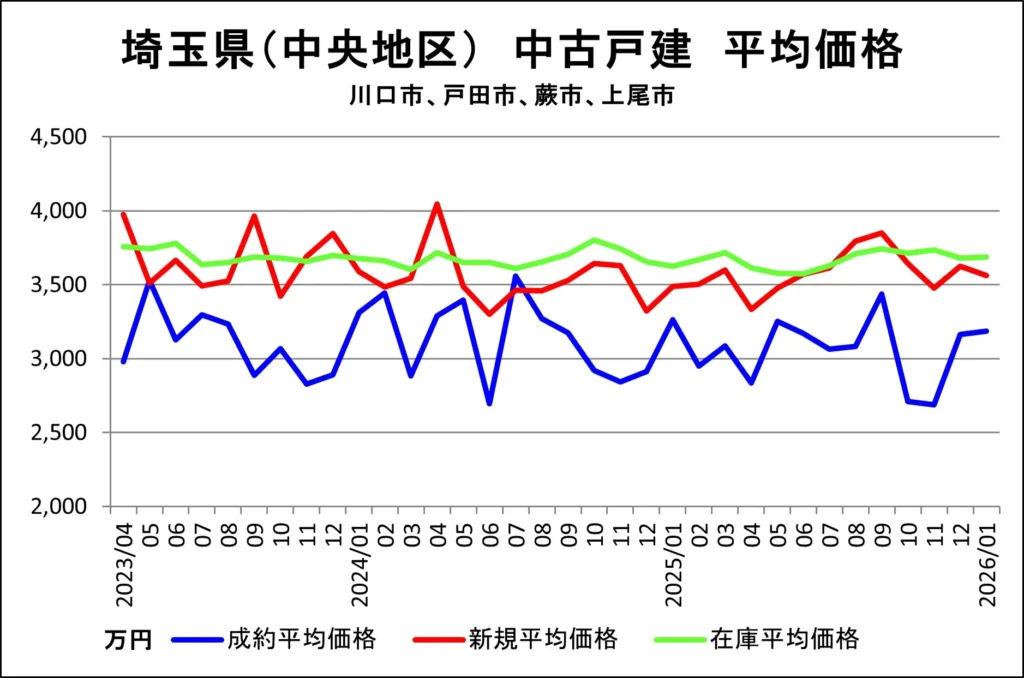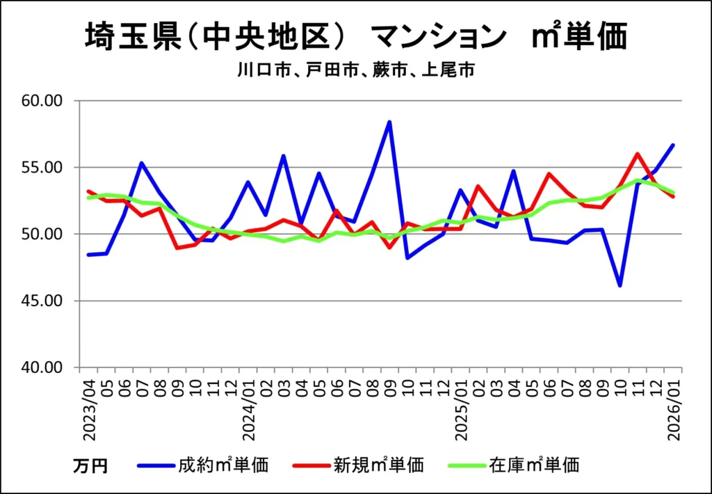 川口市の中古マンション相場と価格推移・中古マンション成約、販売中在庫、新規販売の各㎡単価推移