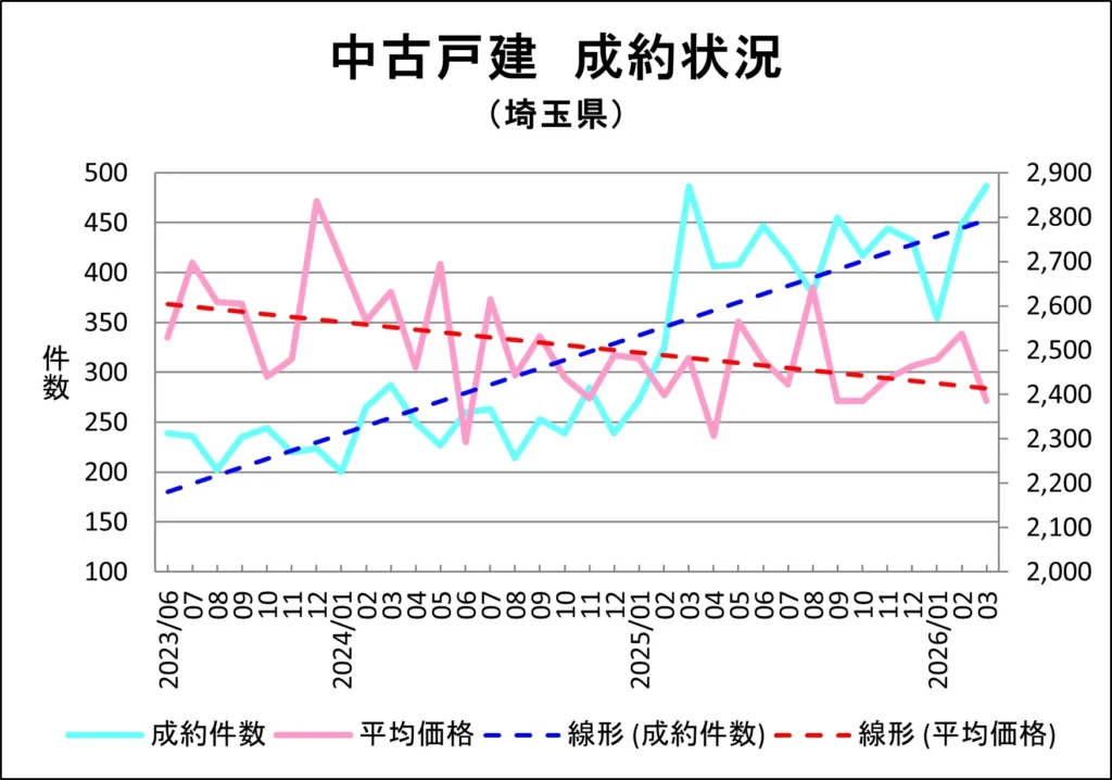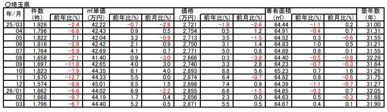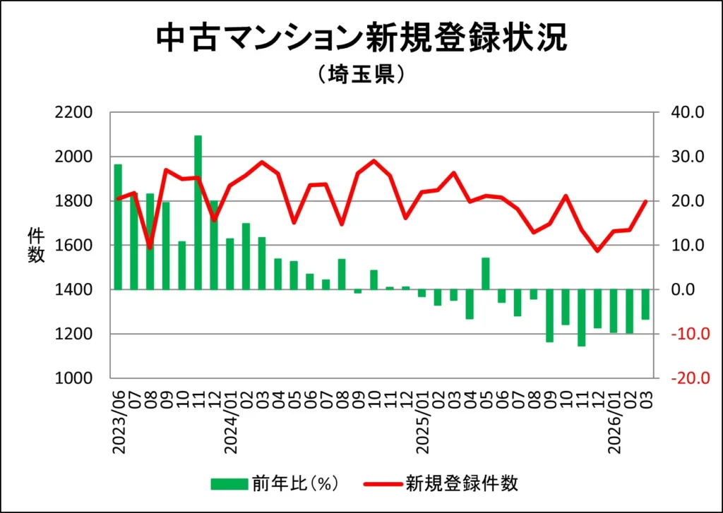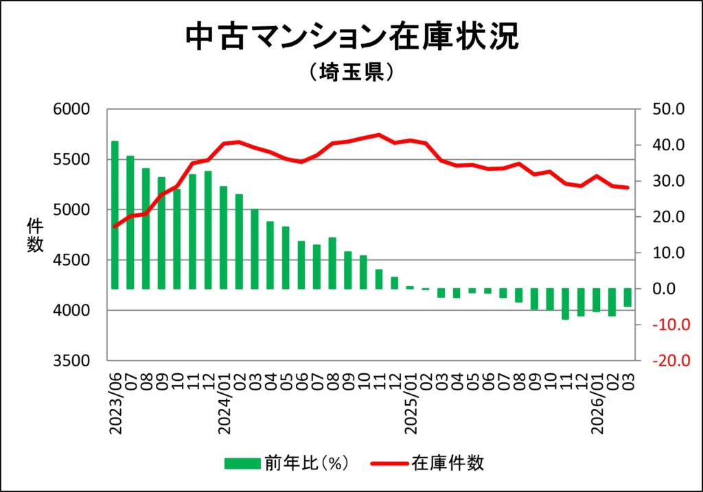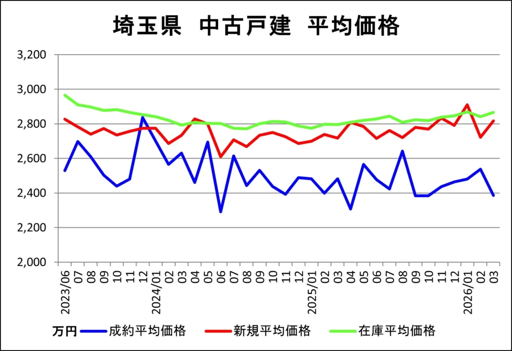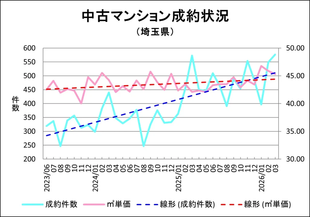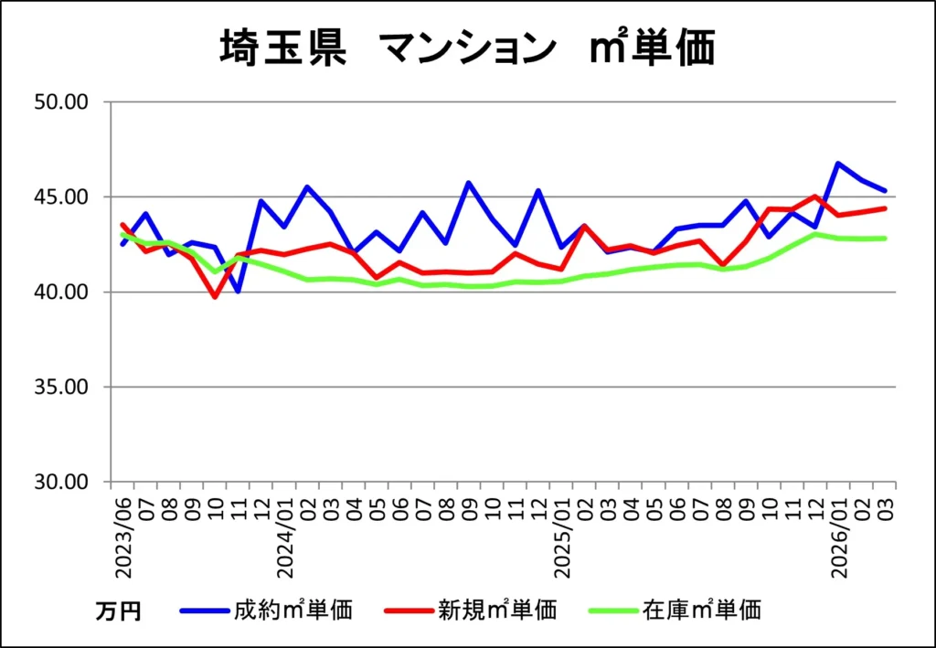 埼玉県の中古マンション成約、販売中在庫、新規販売の各㎡単価推移